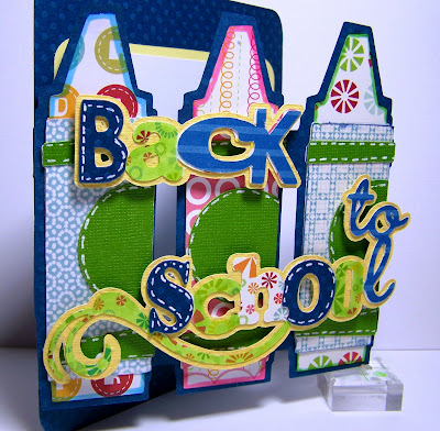 The Back to School phrase was cut in four pieces - the shadow in yellow, the icon cut in a white grounded multi print, a blue stripe and a darker blue solid. In the end, I thought that the white background multi print was too light, so I colored over most of the white letters with a lime green Copic marker.